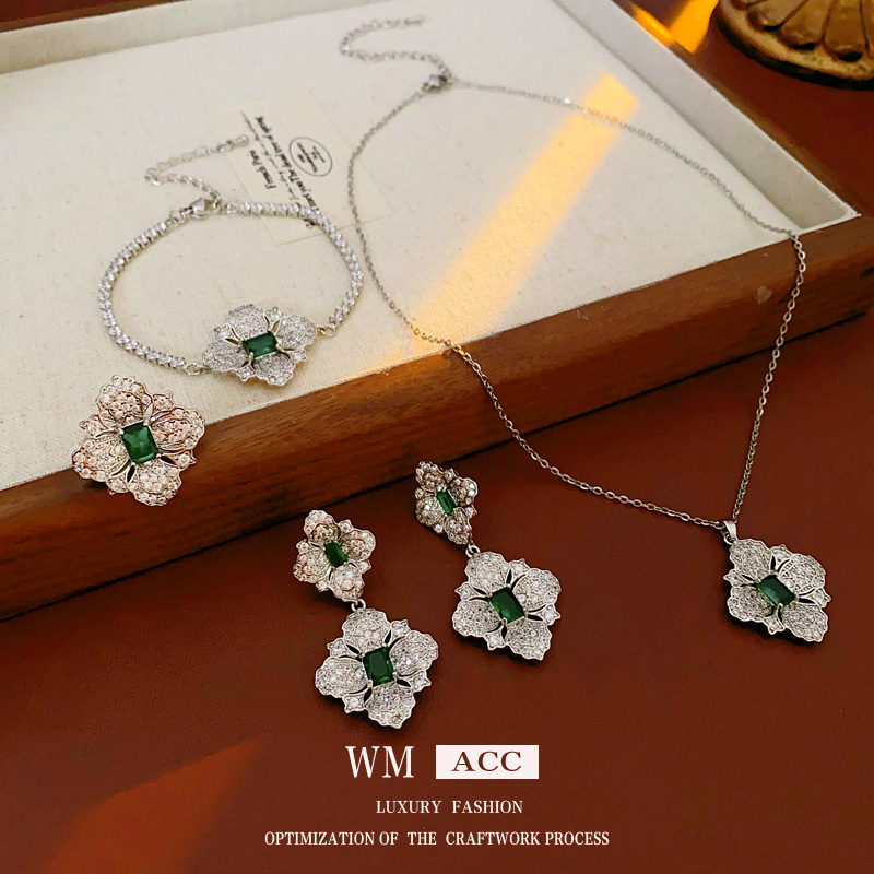 Silver Needle Zircon Rhombus Flower Earrings Necklace Accessible Luxury Cold Style Ring Bracelet Elegant High-End Jewelry Set