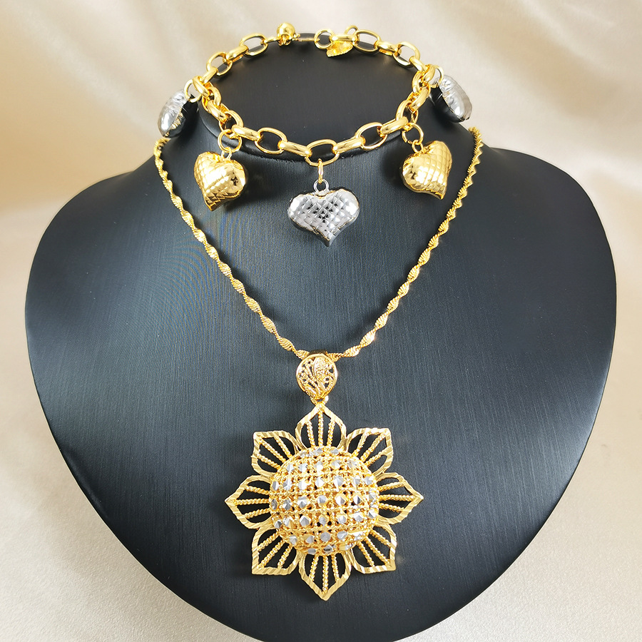 24K Gold Plated Fashion Bohemian Heart Pendant Bracelet and Flower Design Necklace, Female Jewelry Set