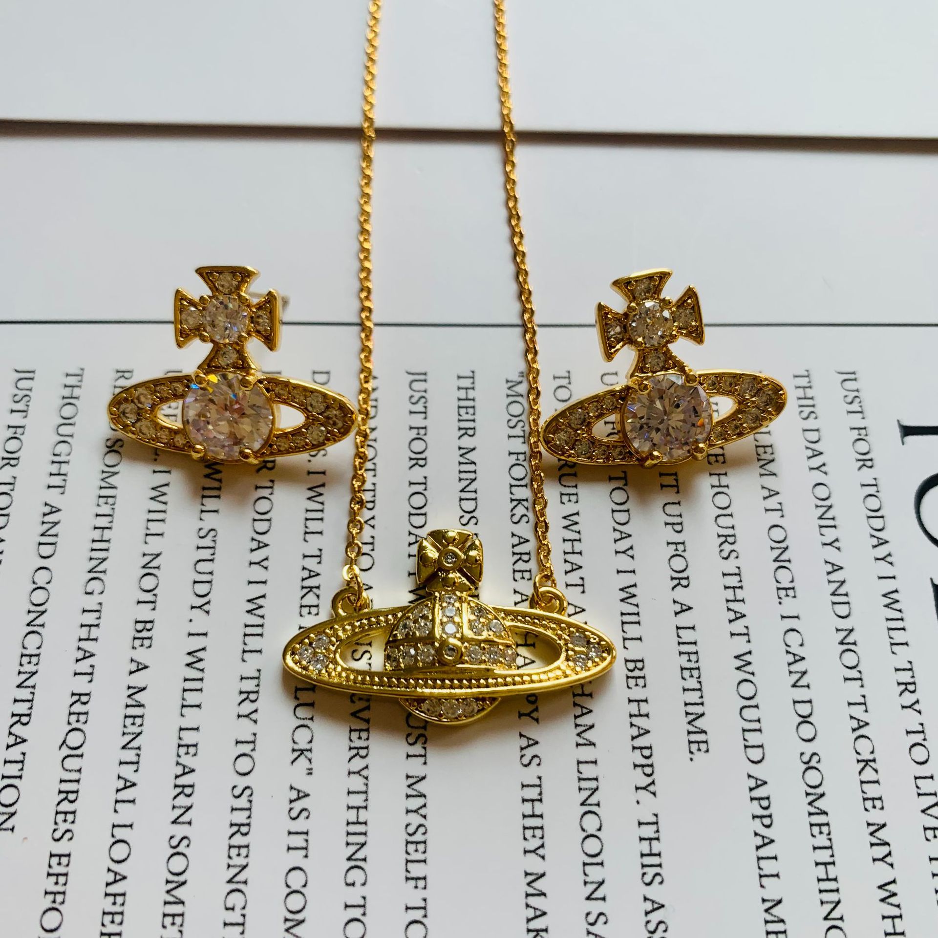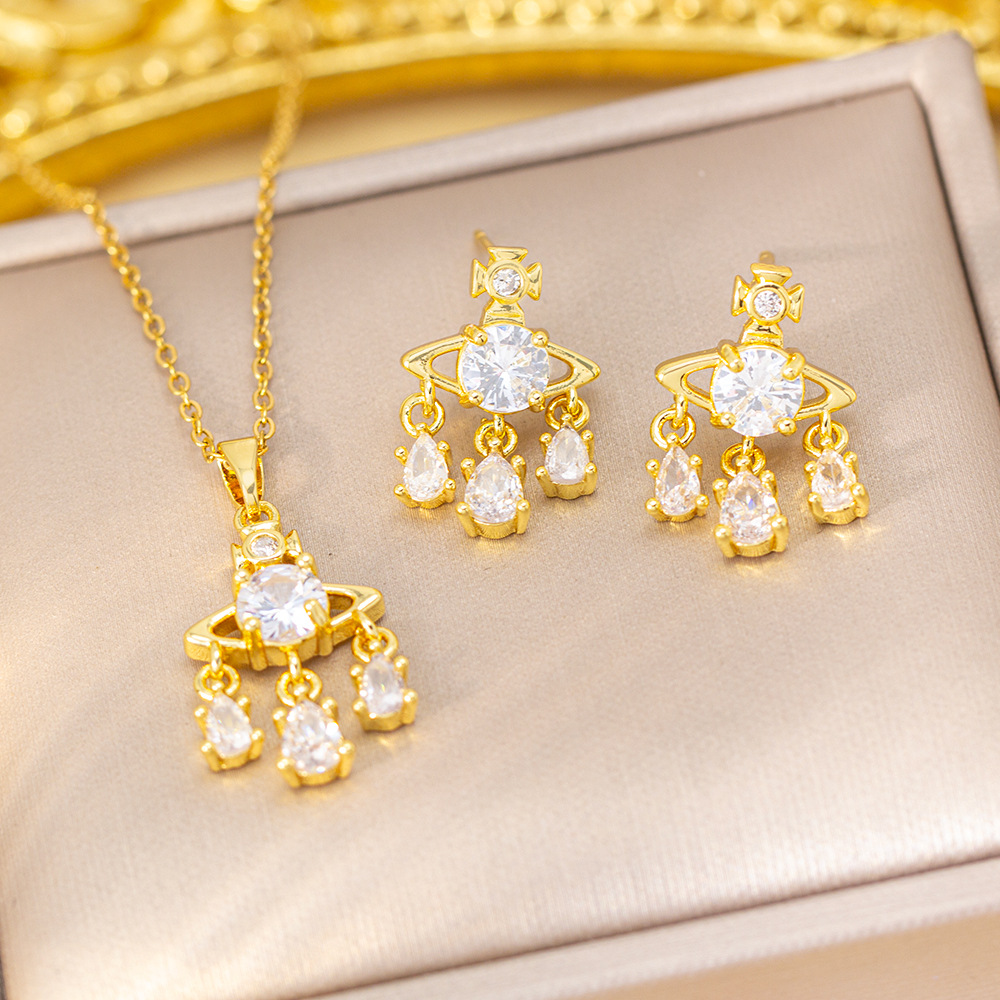 Copper plated real gold universe Saturn jewelry wax inlaid zircon necklace earrings temperament niche sense jewelry