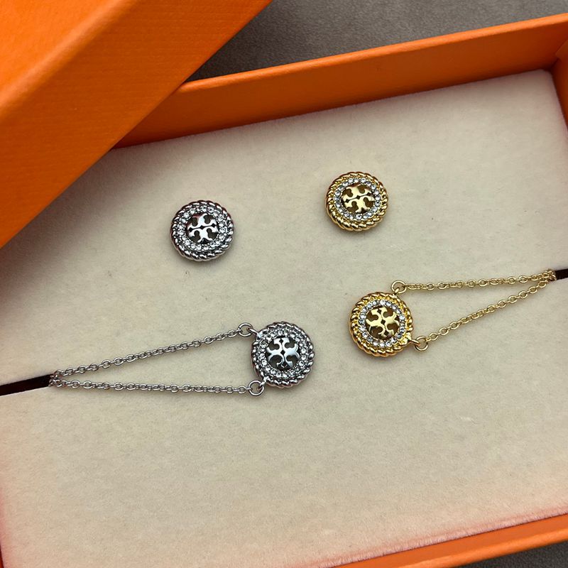 Rhinestone Inlaid Threaded Round Cut Out Double t Logo Plated 18K Gold Earrings Necklace European and American Export Jewelry Wholesale