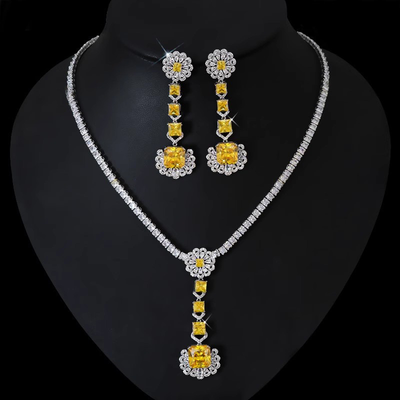 Fashion all-match ice flower cut pink diamond necklace goose yellow pendant imported high carbon diamond earring ring caibao suit women