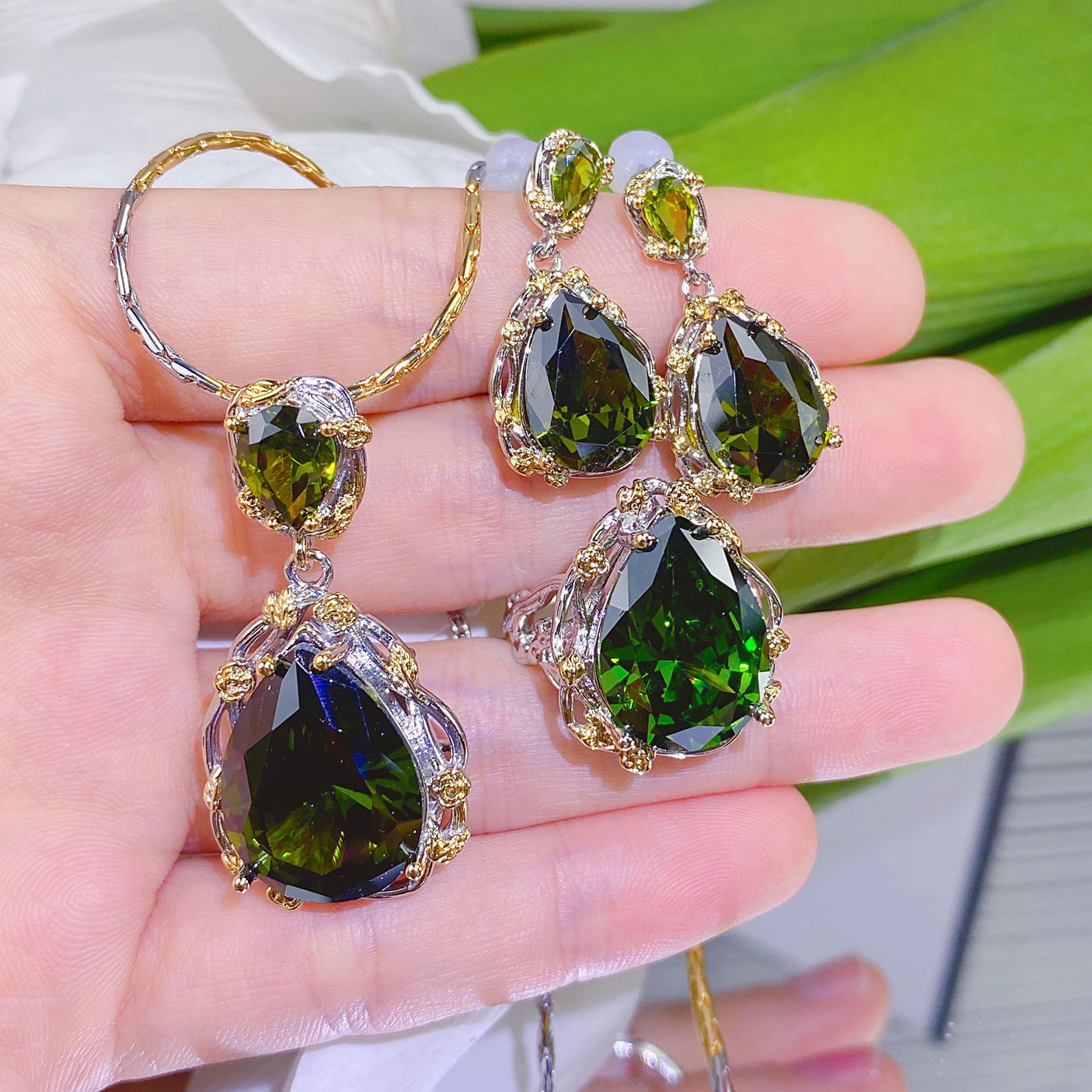 Italian Court Style Caibao Set Two-color Golden Olive Green Diamond Pendant Water Drop Pear-shaped Earrings Open Ring for Women