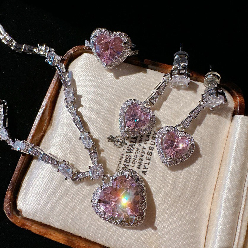 Socialite Fashion Pink Love Zircon Necklace Heart-shaped Pink Diamond Light Luxury Pendant Earrings suit Color Treasure Ring Women