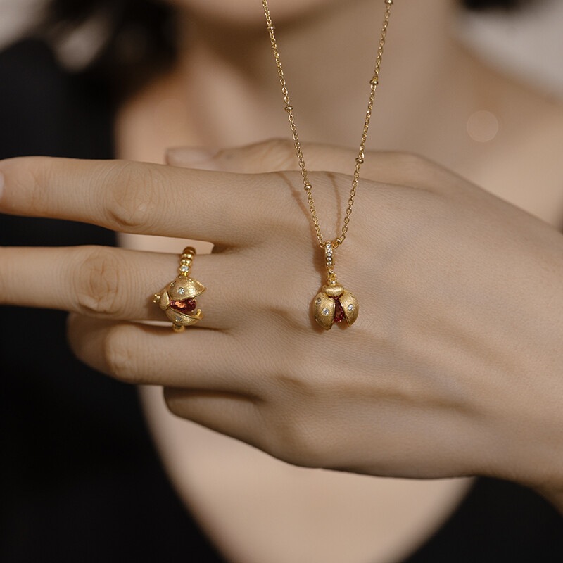 New Chinese Style Vintage Brushed Ruby Ladybug Ring Necklace Ancient Method Niche Unique Fashionable Cute Jewelry suit