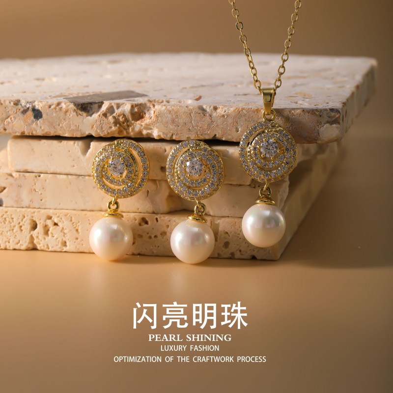 Shiny Pearl Copper Earrings Necklace Set Imitation Pearl Non-Fading Women's Light Luxury High-End Cross-Border Wholesale Jewelry