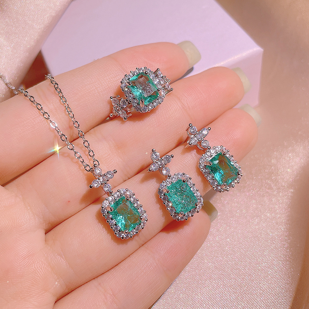2024 Douyin Tiktok Live Broadcast Fashion Supply European and American Style Retro Artificial Paraiba Jewelry Three-Piece Set