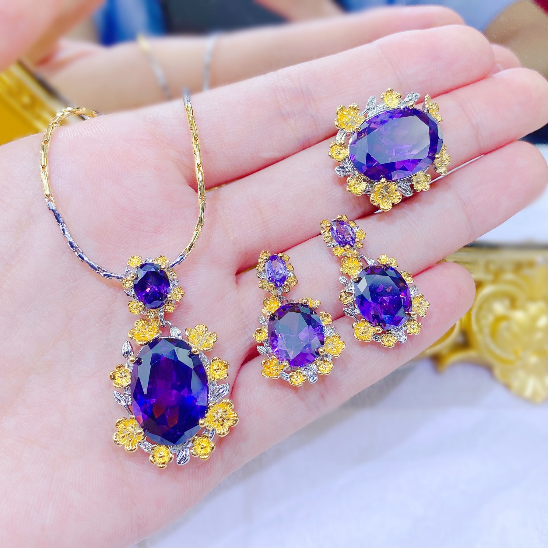 Fashion Joker Purple Lihui Necklace Purple Diamond Pendant Imported High Carbon Diamond Earrings Ice Flower Cut Ring Caibao suit Women