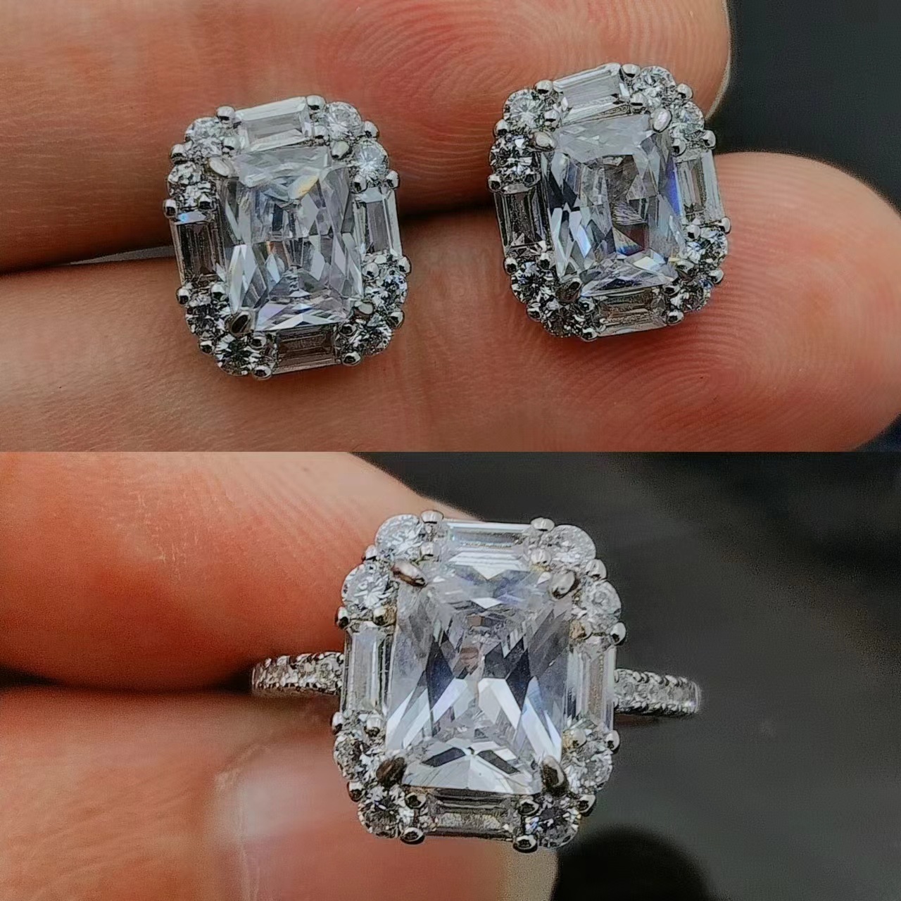 European and American Light Luxury Fashion Elegant Rectangular Diamond Zircon Color Treasure suit Pendant Earrings Ring Two-piece Set Jewelry