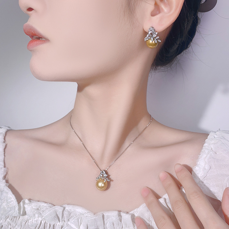 Pearl Set High-End Zircon Silver Needle Earrings Necklace Flower-Shaped Light Luxury Elegant Versatile Fashion Women's Wholesale