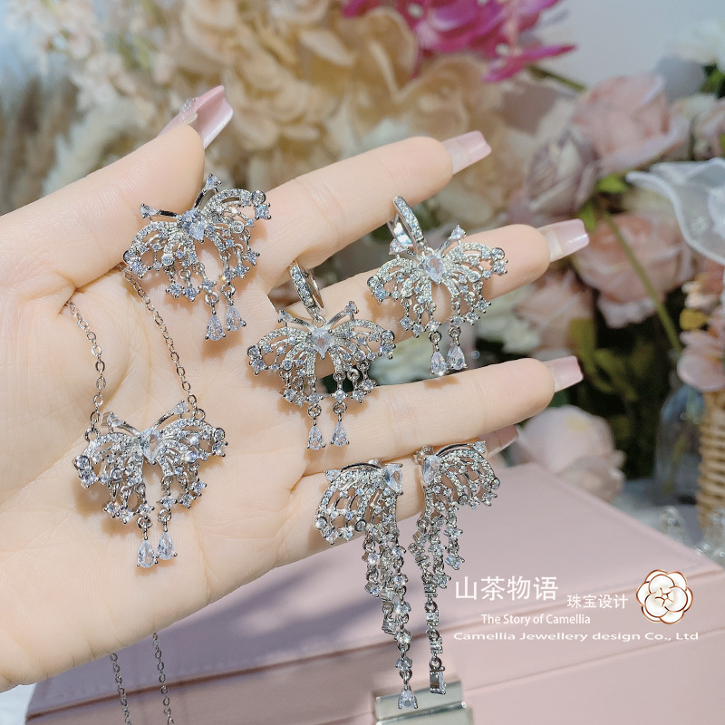 Camellia niche design Super fairy Hollow flashing butterfly suit micro-inlaid full diamond high-grade sense name Slow Ring