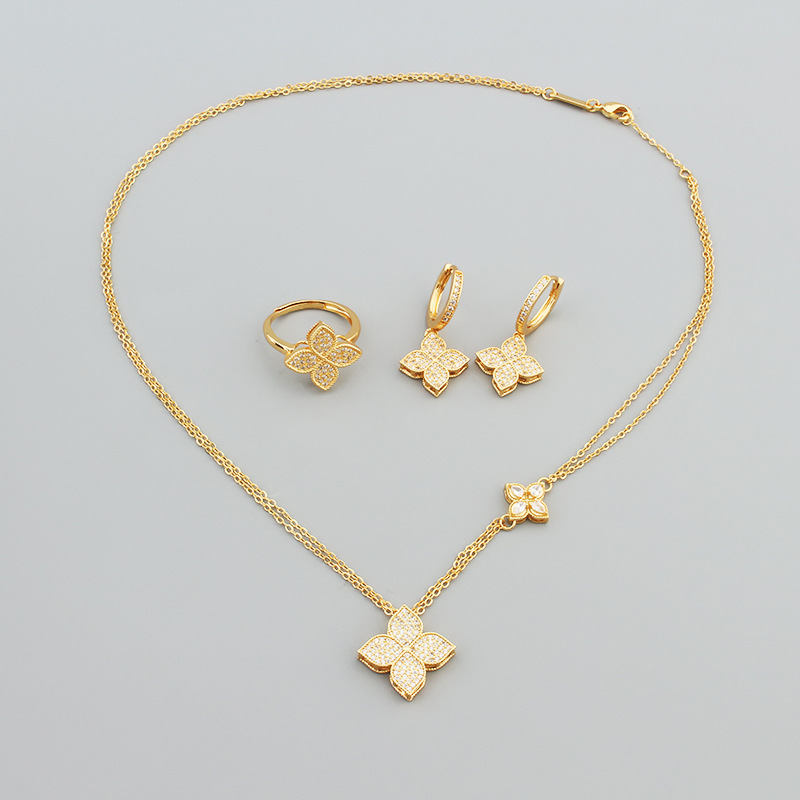 New Ins Four-leaf Clover Full Diamond Popular Necklace Ring Set Earrings Vietnam Sand Gold Copper Alloy Color Preservation