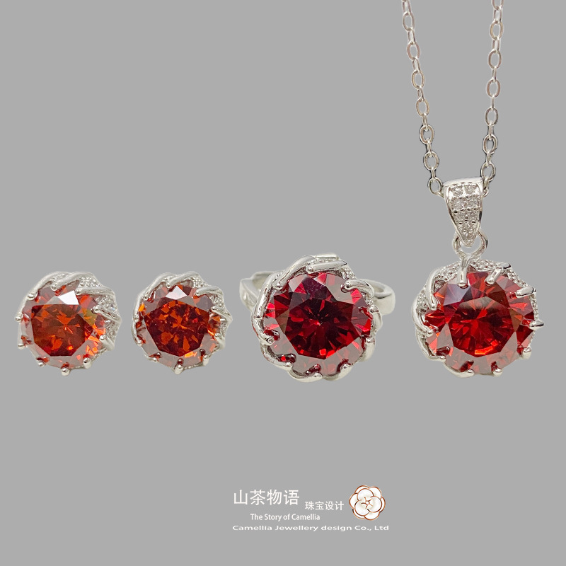 Camellia Cross-border New Inlaid Pigeon Ruby Ring Light Luxury Niche Design Love Earrings Necklace Three-piece Set