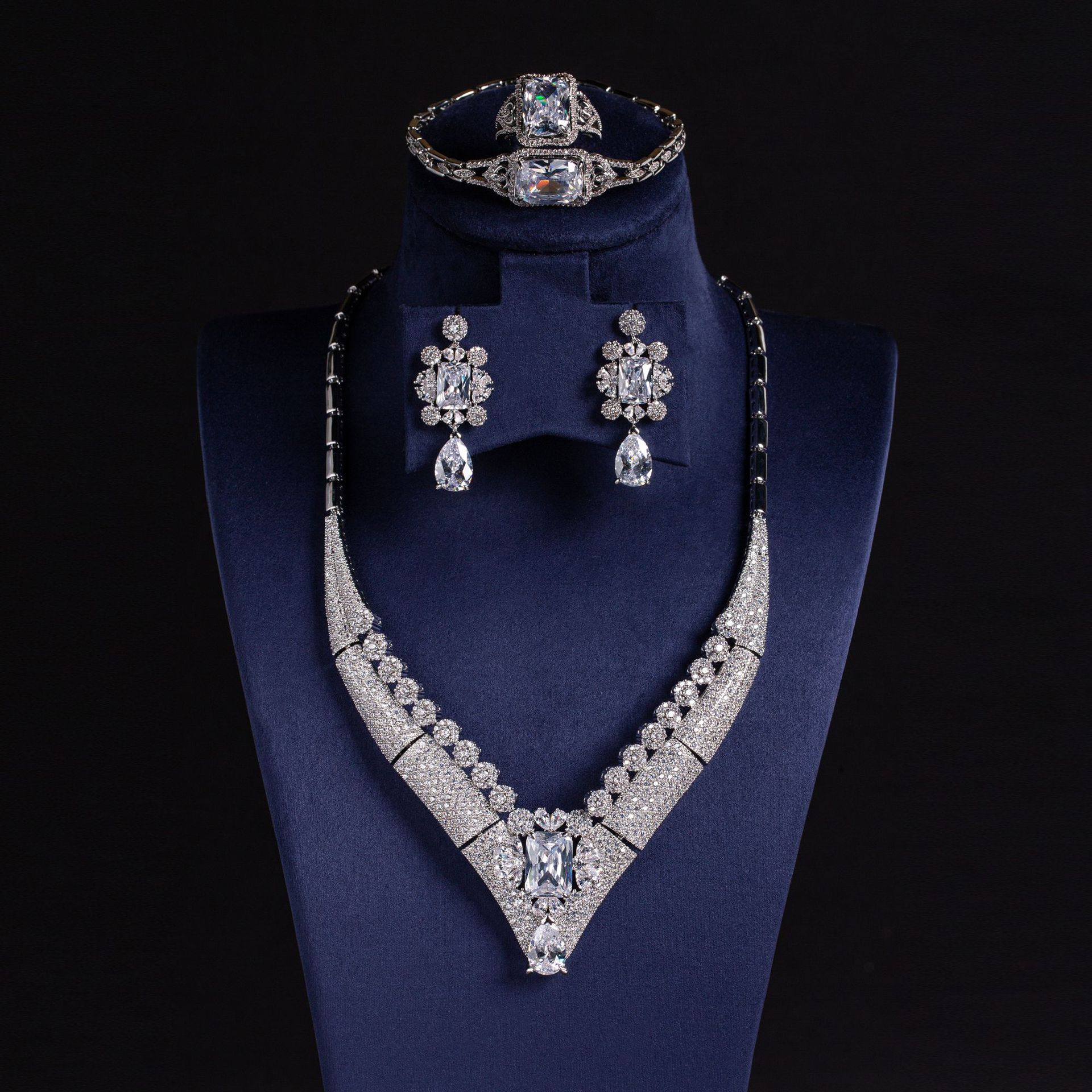 Fashionable and Beautiful Necklace and Earrings Set, Zircon Shiny Earrings, Wedding Party Four-Piece Set, Wedding Dress Accessories