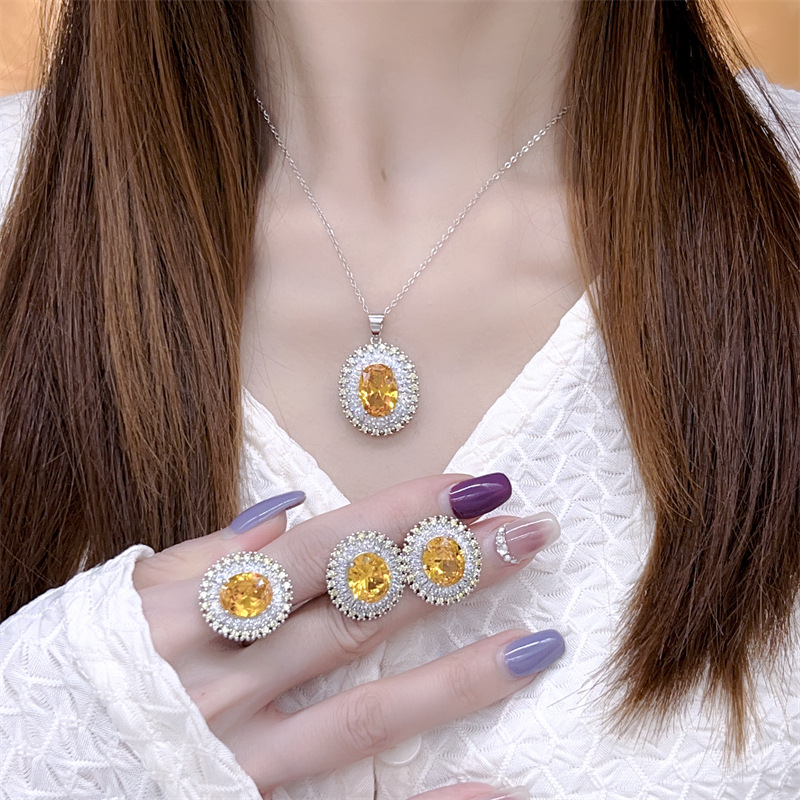 New Luxury Luxury Coconut Round Yellow Diamond Zircon Jewelry Three-Piece Set Simulated Citrine Ring Earrings Pendant Necklace