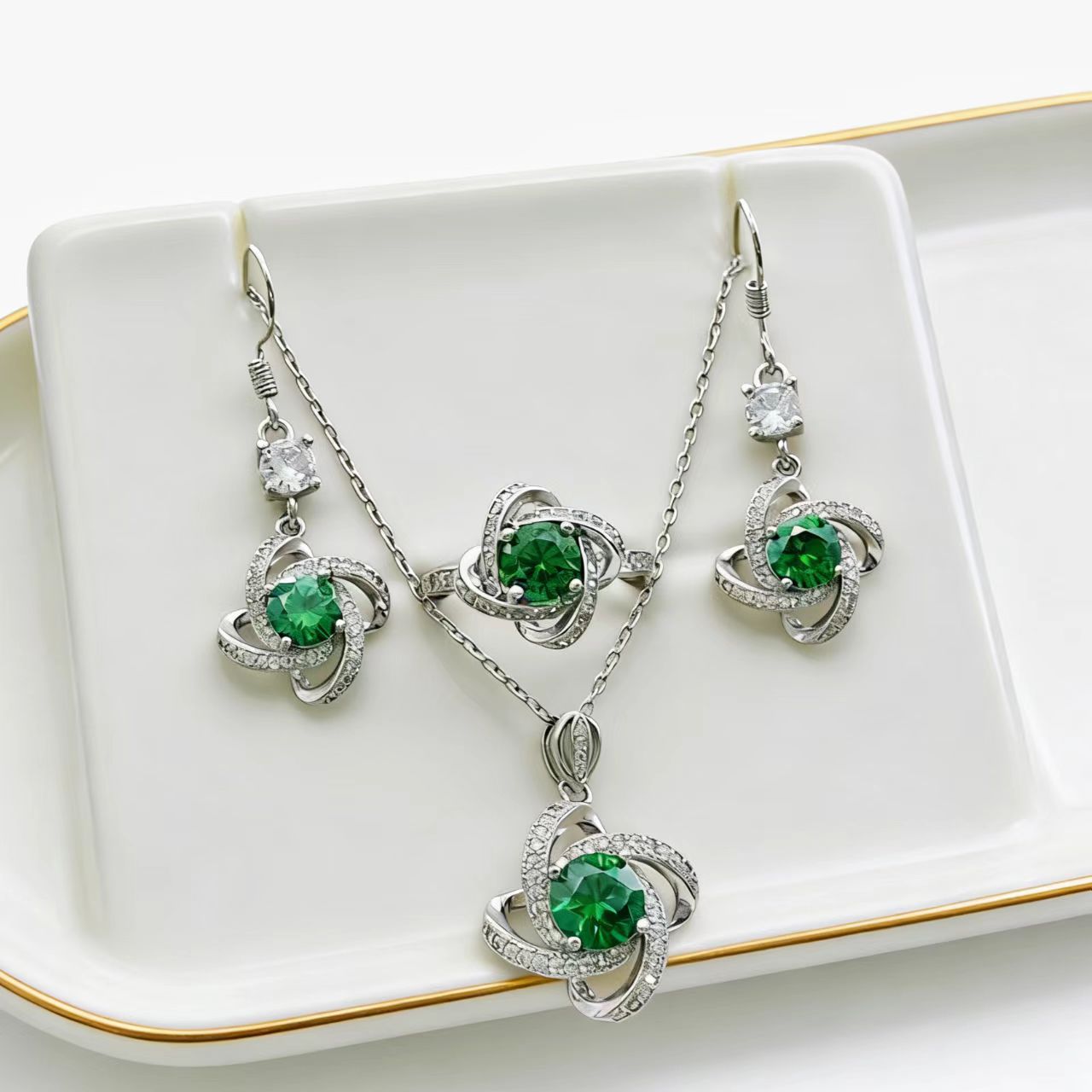European and American Hot-Selling Jewelry Artificial Emerald Ruby Four-Leaf Clover Open Ring Earrings Necklace Jewelry Set for Women