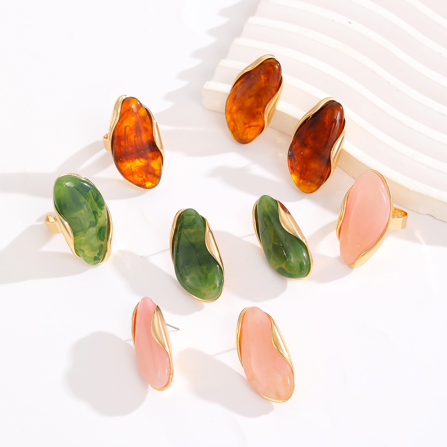 Maillard Style Asymmetrical Resin Alloy Earrings Women's Fashion Retro Coffee Color Electroplated Earrings Ring Set Decoration