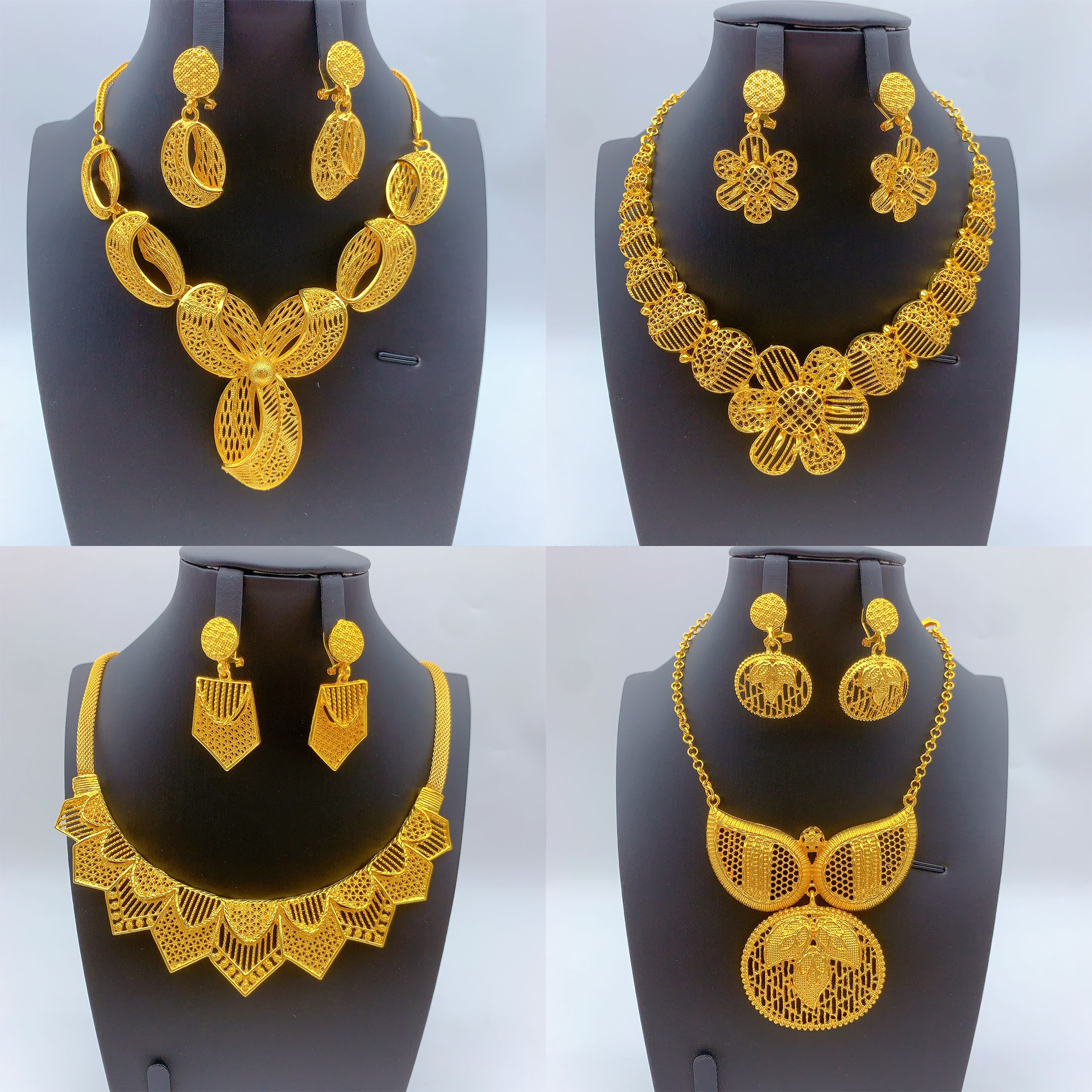 Hot Selling Two-Piece Alloy Jewelry Nigerian Dubai Necklace Earrings Bridal Banquet Jewelry Jewelr Ready Stock