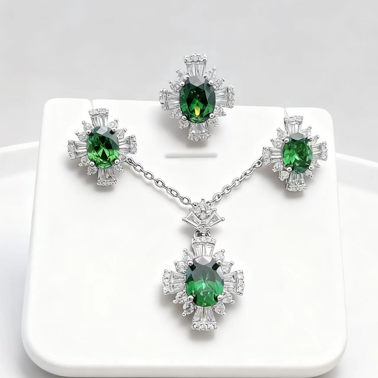 New Luxury Colored Gemstone Jewelry Set for Women Imitation Coconut Round Egg-Shaped Emerald Ring Earrings Pendant Necklace