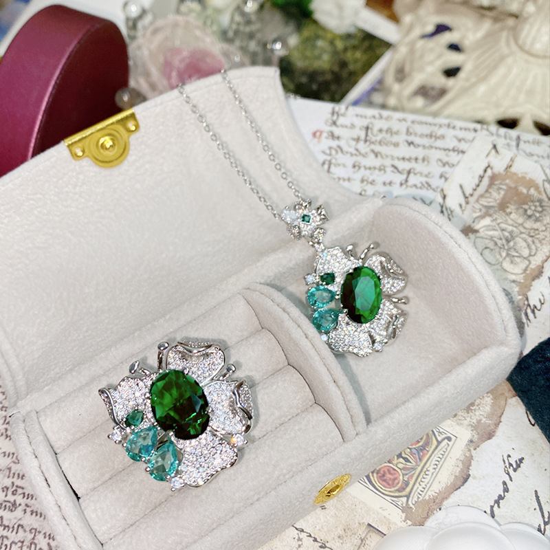 Camellia jewelry foreign trade Peacock Emerald Frost flower butterfly design ring necklace bright luxury rich woman suit