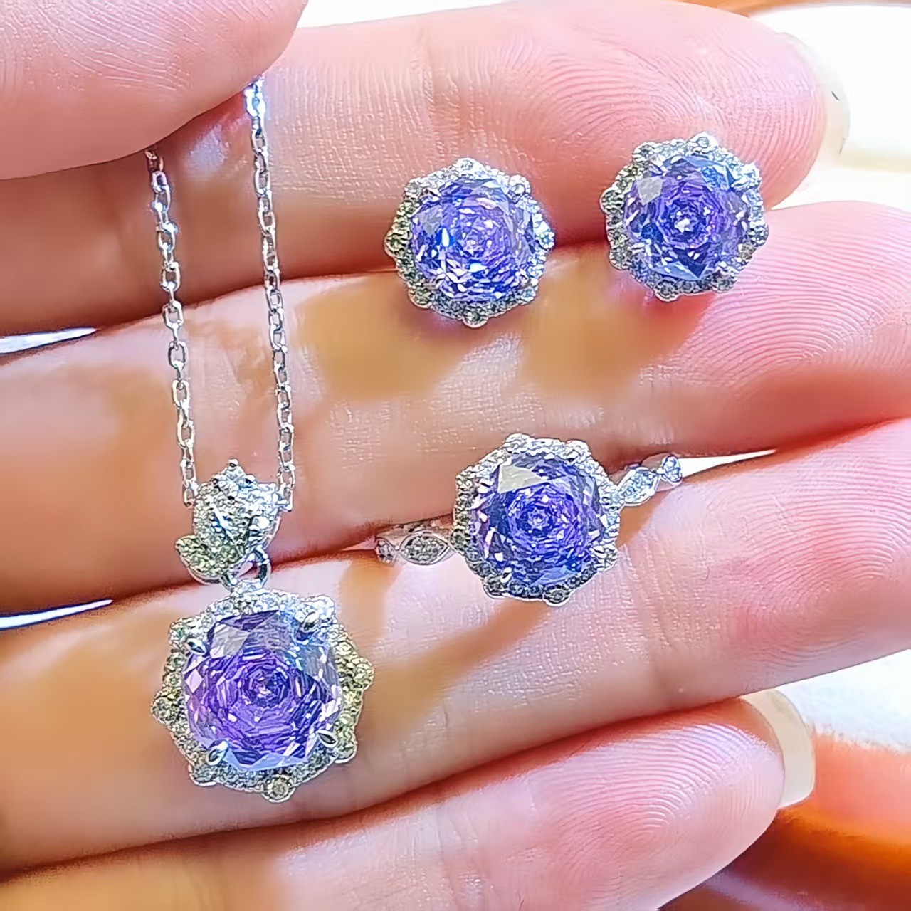 Violet Rose Cut Pendant Necklace Inlaid with High-Carbon Diamond Earrings Rose Flower Ring Colored Gemstone Jewelry Three-Piece Set for Women
