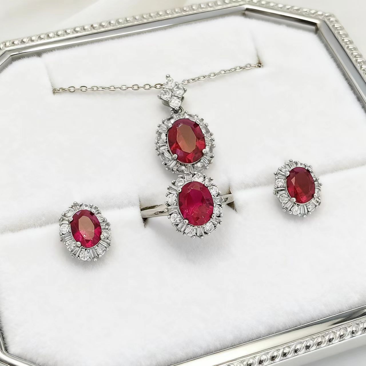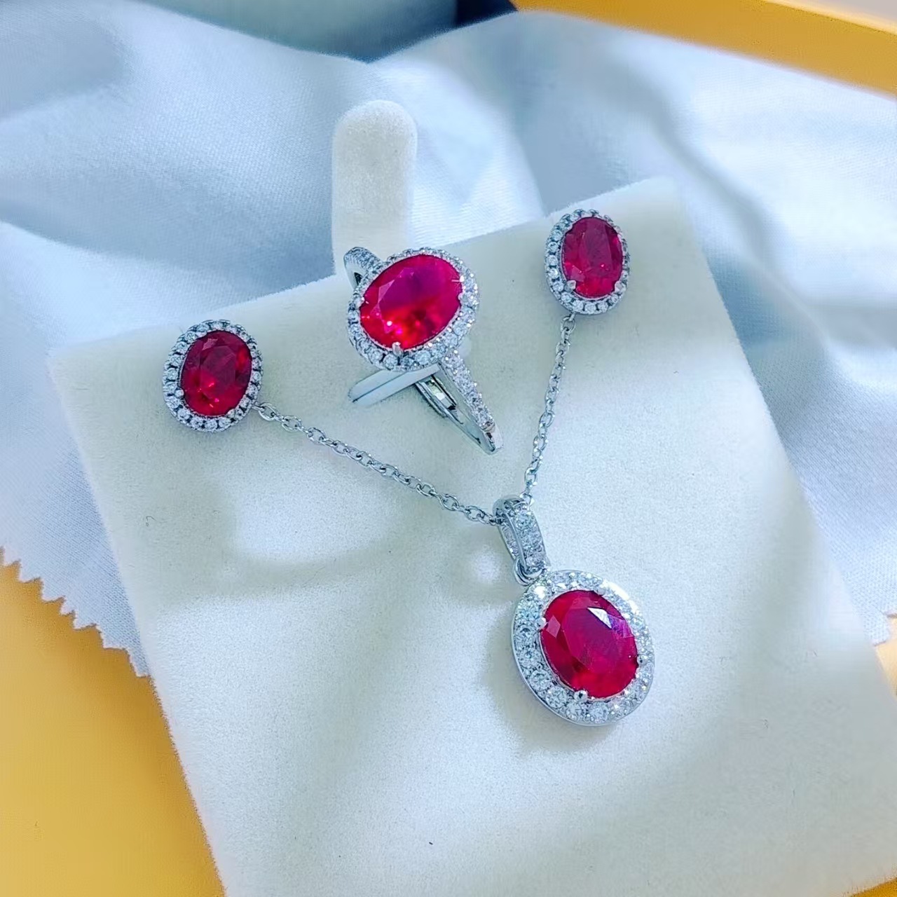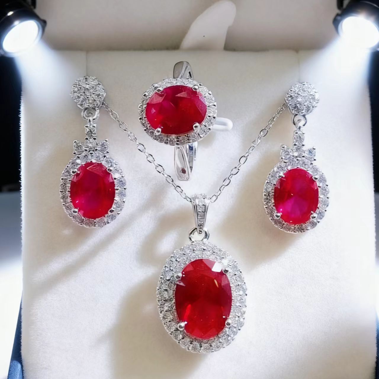 Fashion Jewelry Cultivation Ruby Jewelry Three-Piece Set Live Selling Full Diamond Ring Pendant Earrings