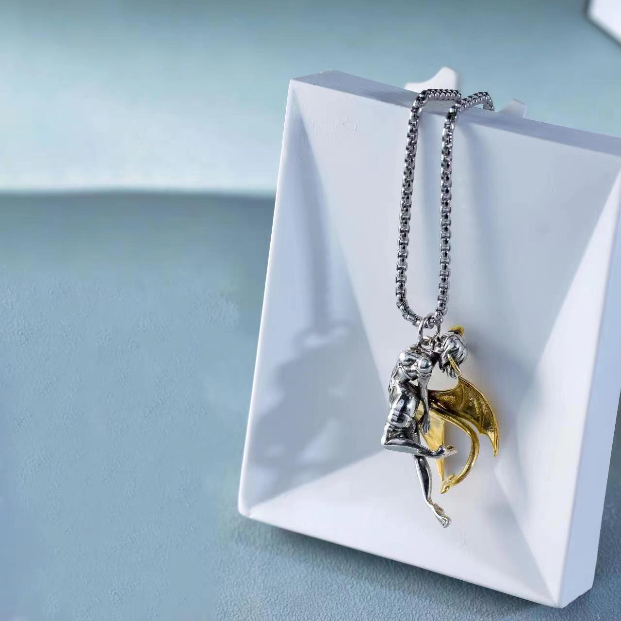 Imitation Silver Devil Angel Necklace for Male Girlfriend Couple Retro Niche Succubus Pendant Sweater Chain Valentine's Day Gift