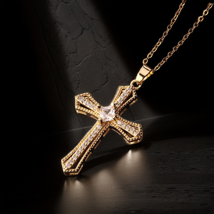 European and American Personalized Fashion Cross Necklace Copper Gold-Plated Zircon Pendant Cross-Border Necklace Jewelry Women's Versatile Pendant