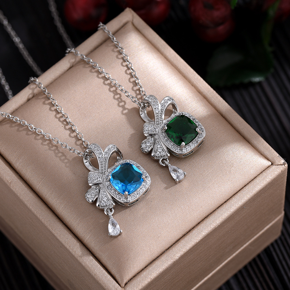 Cross-border live new retro inlaid emerald inlaid pendant Women's Light luxury simple Korean bow necklace