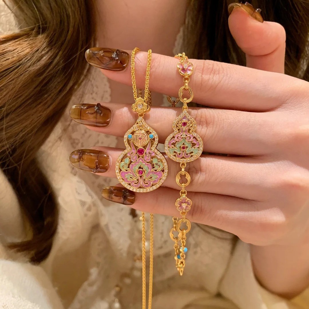 Trendy Pink and Green Gourd Necklace with Traditional Enamel Cloud and Blessing Character for Women, Fashionable and Versatile