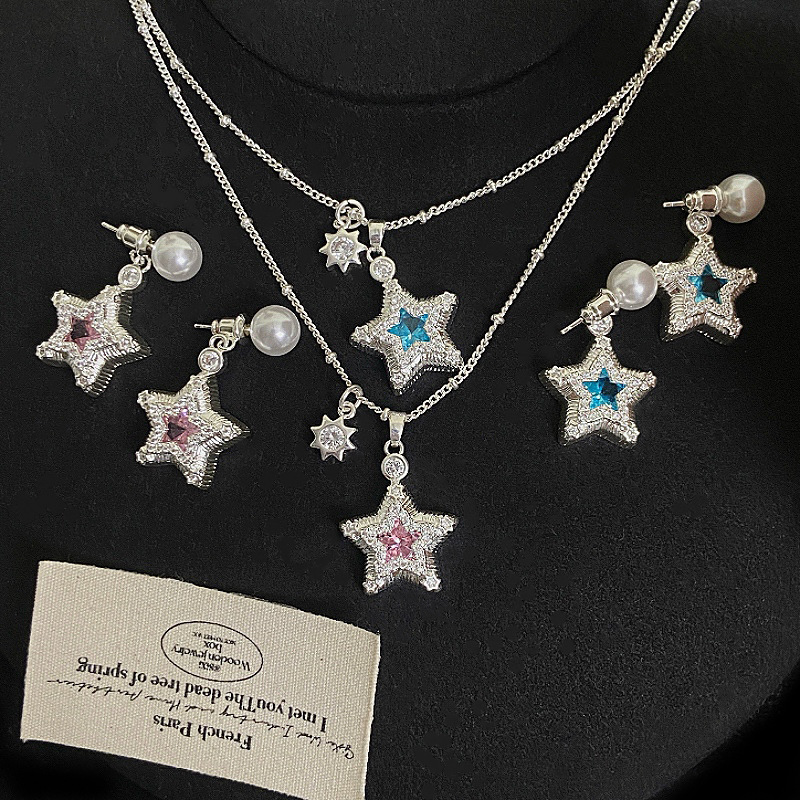 Silver White Five-Pointed Star Necklace Set, Light Luxury Pink Star Zircon Clavicle Chain, Sweet Little Fragrance Blue Pendant