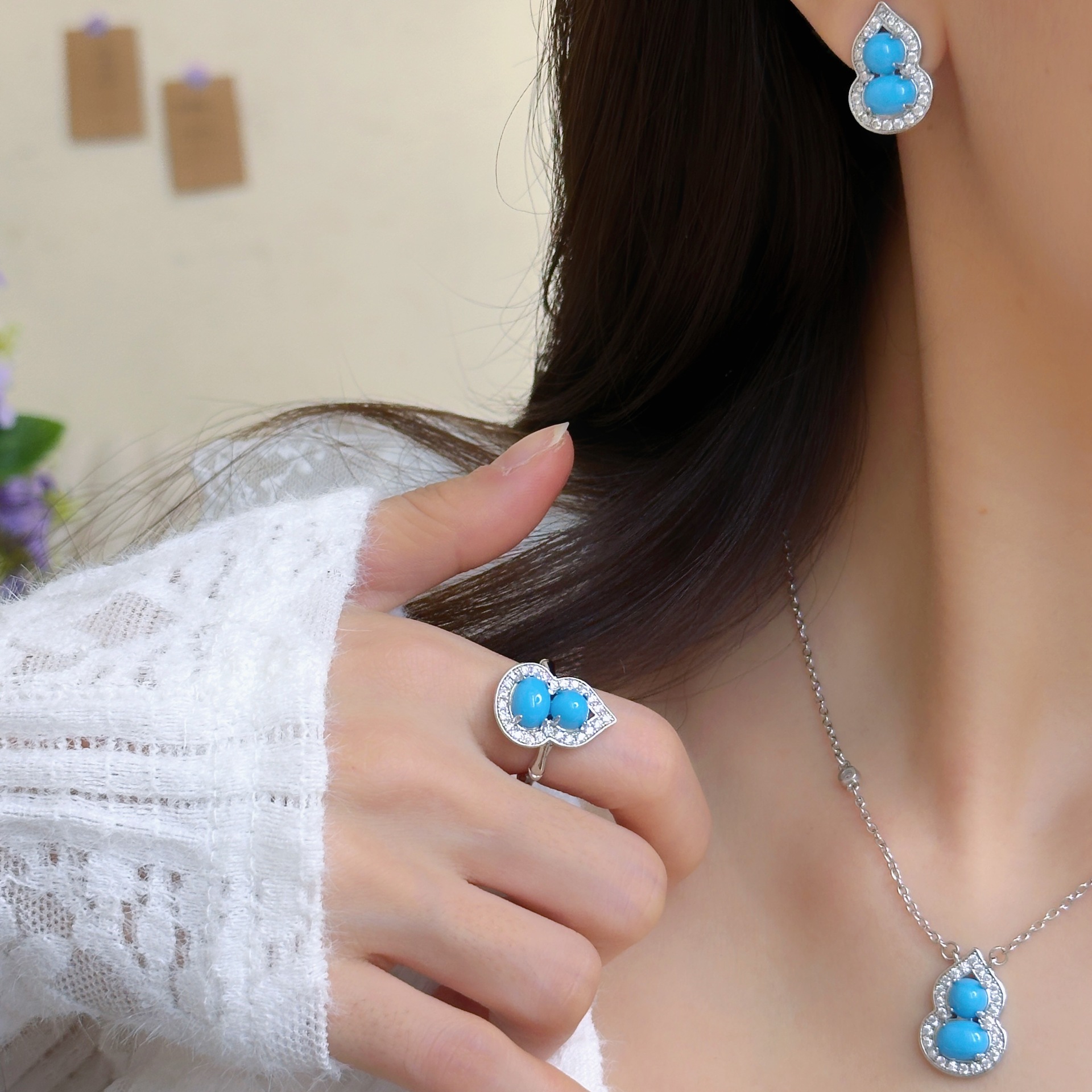 New Chinese Style Exquisite Micro-inlaid Imitation Turquoise Gourd Ring Earrings Necklace Trichet White All-match Earrings Clavicle Chain