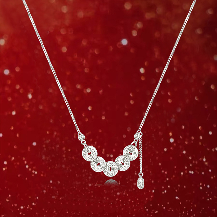 2025 This Year of Life Flash Money Five Emperors Coin Necklace Chinese Ancient Method to Make Money and Treasure Five Blesques Money String Clavicle Chain