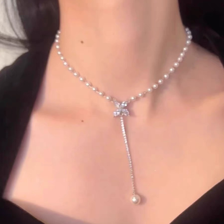 Butterfly zircon pearl necklace light luxury niche design long fashion high-grade temperament summer necklace for women