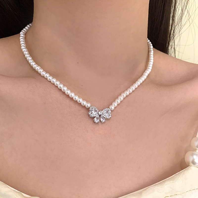 French Entry Luxury Bow Pearl Necklace Niche Retro Elegant High-end Sense Neck Chain Elegant Micro Zirconium Clavicle Chain for Women