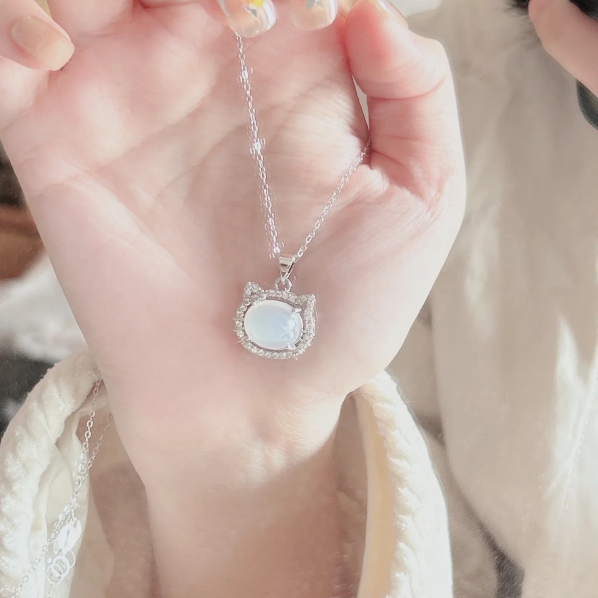 New Style Fresh and Sweet Imitation Chalcedony Necklace Cat's Eye Kitten Necklace for Women Versatile and Cute Tiktok Wholesale