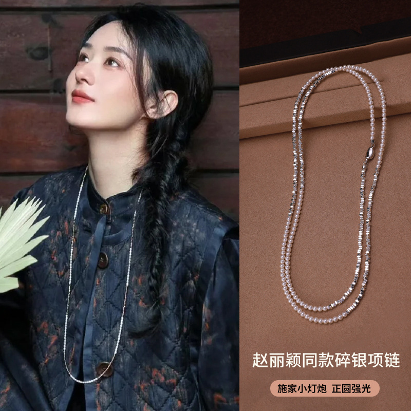 Zhao Liying's Style ~ Broken Silver Pearl Sweater Chain Long Necklace New Chinoiserie Accessible Luxury Millet Bead Stacked Necklace