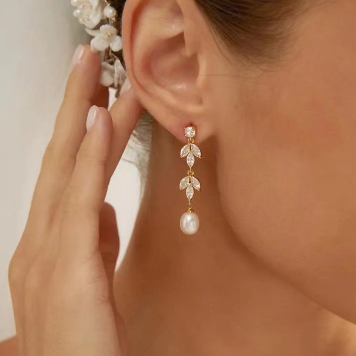 European and American Brass Electroplated Real Gold Zircon Pearl Earrings Earrings Leaf Inlaid Earrings Personalized Fashion Earrings