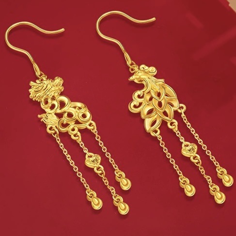 Chinese Dragon and Phoenix Earrings Shajin Supreme Dragon and Phoenix Jubilee Edge New Chinese Wedding Simulation Gold Ear Hook Tassel Earrings