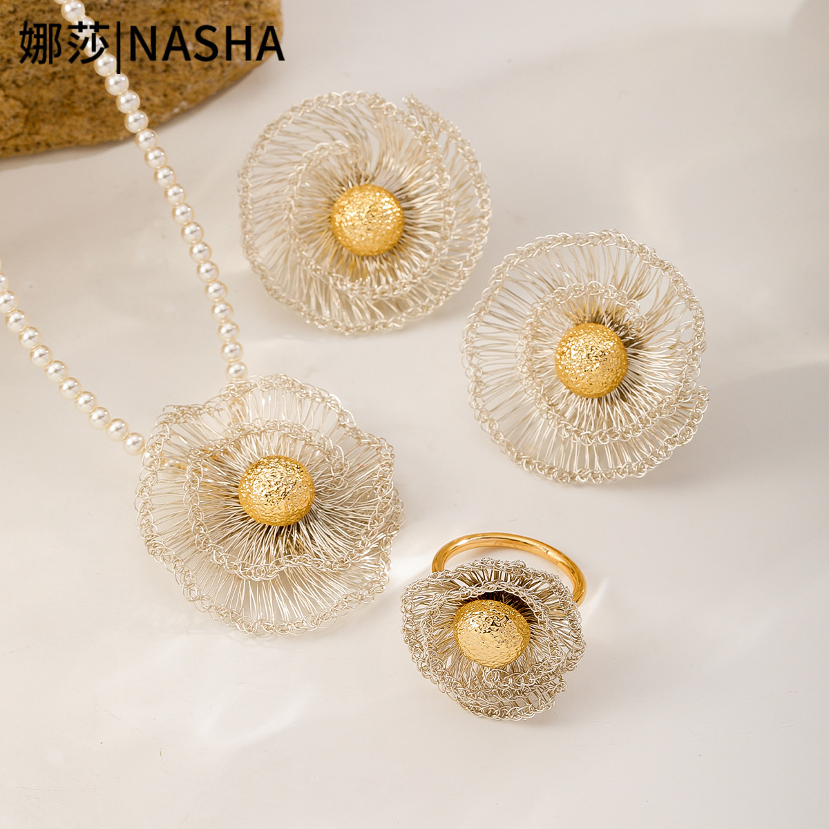 Handmade Copper Wire Sunflower Necklace Pearl Necklace Earrings Ring Necklace Set Retro High-End Jewelry Set