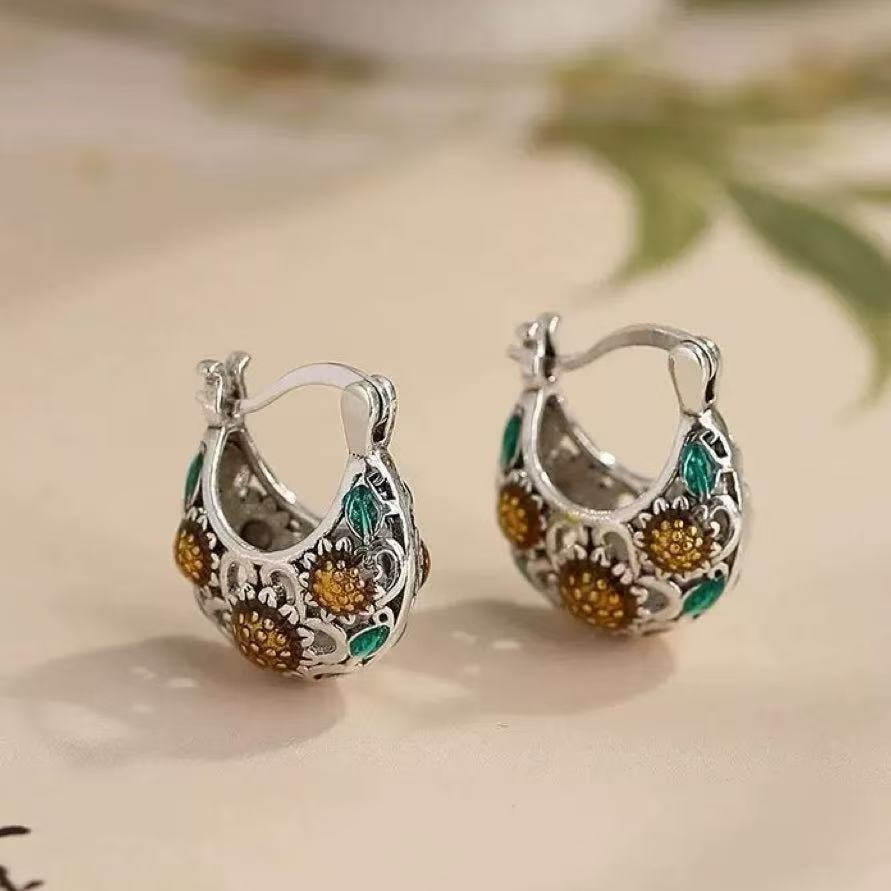 Retro Ethnic Style Drip Glaze Xizang Sunflower Earrings Accessible Luxury High-End Ethnic Style Old Earrings Earrings