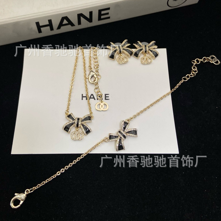 New Style Xiaoxiangfeng 25B Bow Diamond Necklace Bracelet Set Fashionable Mid-Century Style Black Glue Earrings
