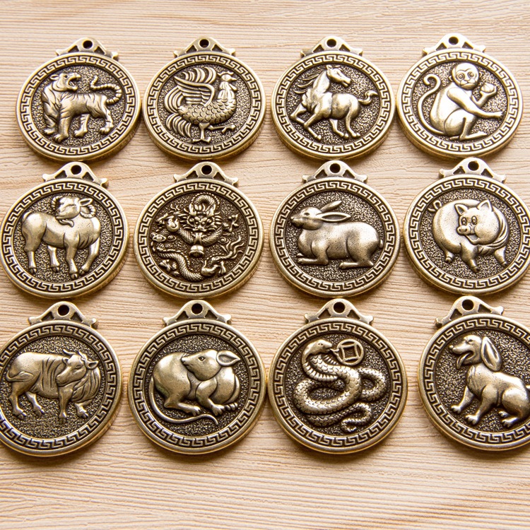 Brass Zodiac Dragon, Chicken, Cow, Horse, Snake, Dog Monkey, Pig, Tiger, Rat, Rabbit, Sheep, Blessing Word Keychain Pendant Gift