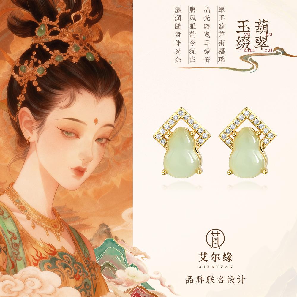 [Emerald Gourd] New Chinoiserie 925 Silver Needle Gold-Plated High-End Earrings Imitation Hetian Jade Fulu Gourd Earrings