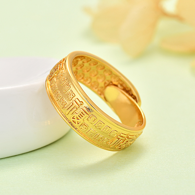 Vintage Vietnamese Gold-Plated Men's Open-Ended Ring with "Fu" Character and Heart Sutra Design, Non-Fading