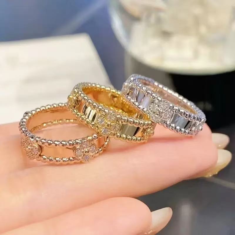 High-End Seiko Round Bead Ring with Diamonds, Narrow Version, 18K Rose Gold Four-Leaf Clover Kaleidoscope Ring, Live Supply