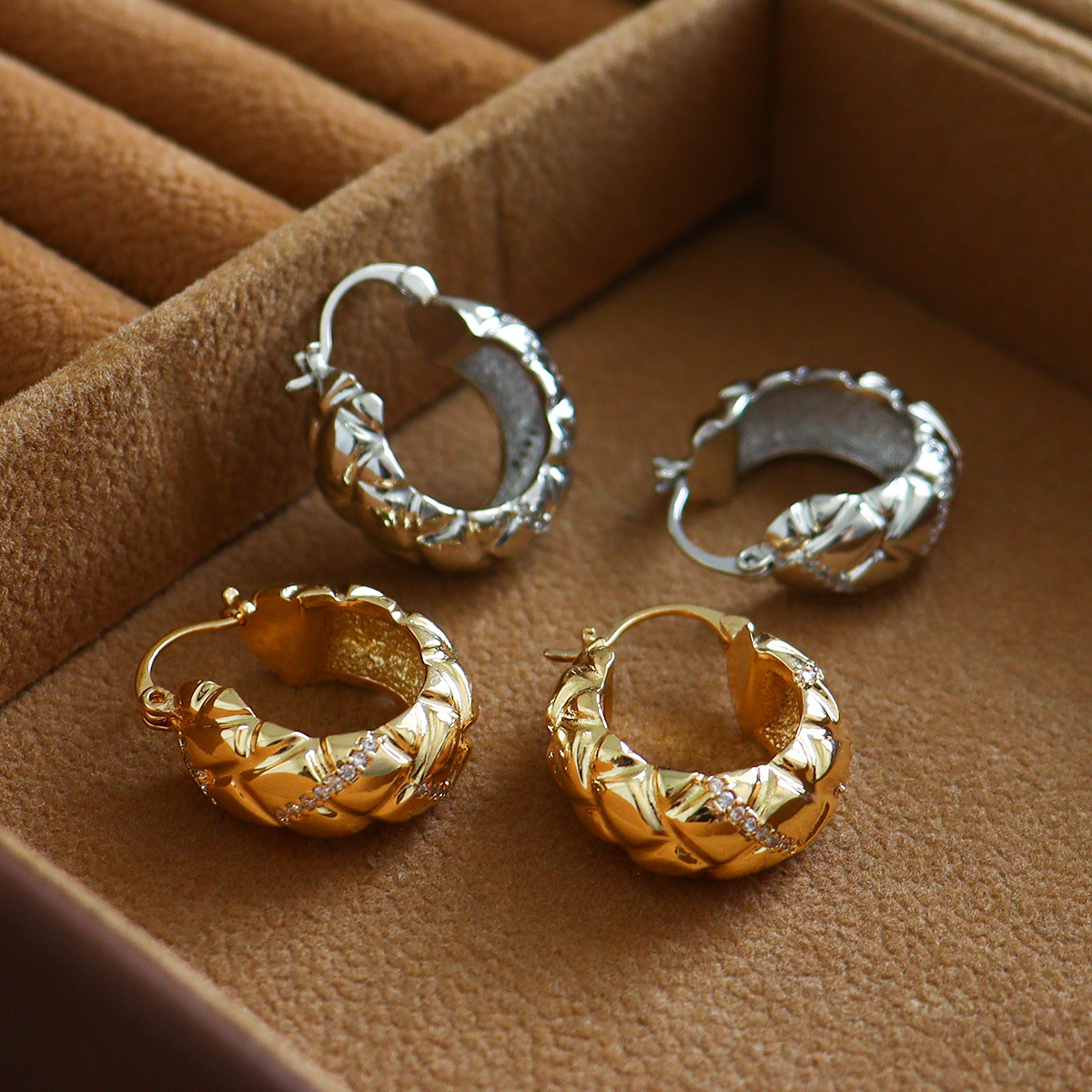 European and American Niche Design Hammered Texture Cross Double Torus Brass Gold-Plated Retro Fashion Stylish Elegant Earrings for Women