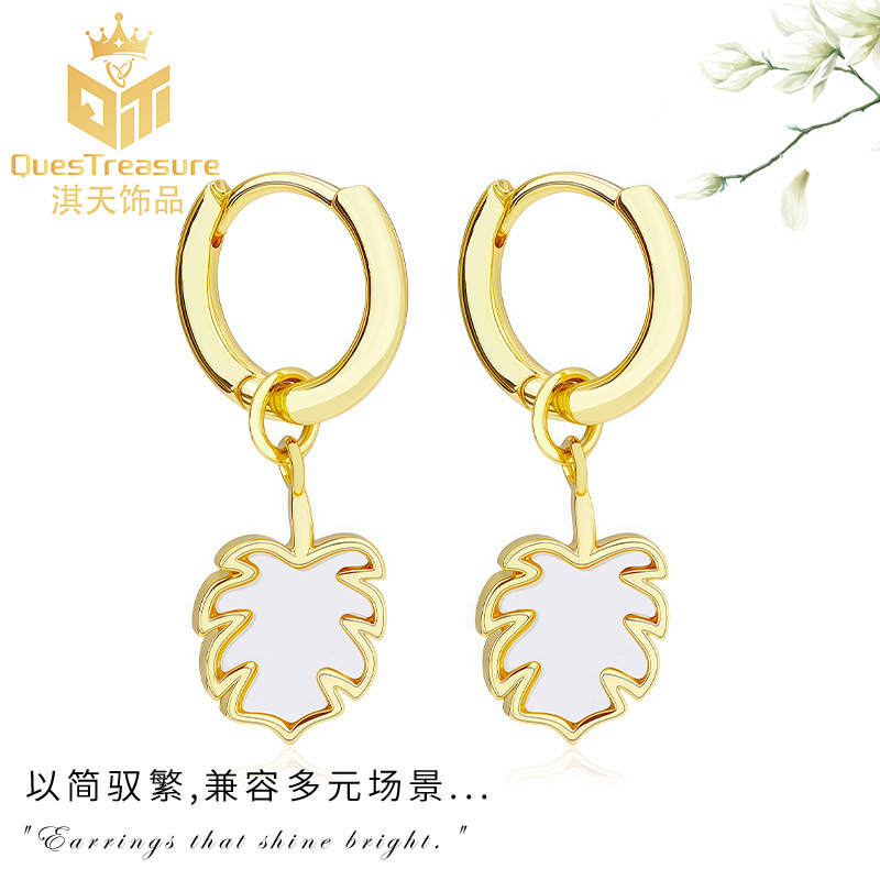 European and American Fashion Light Luxury Mother-Of-Pearl Leaf Pendant Earrings for Women, Copper Plated with Real Gold, Fresh Forest Style Earrings with a High-End Feel