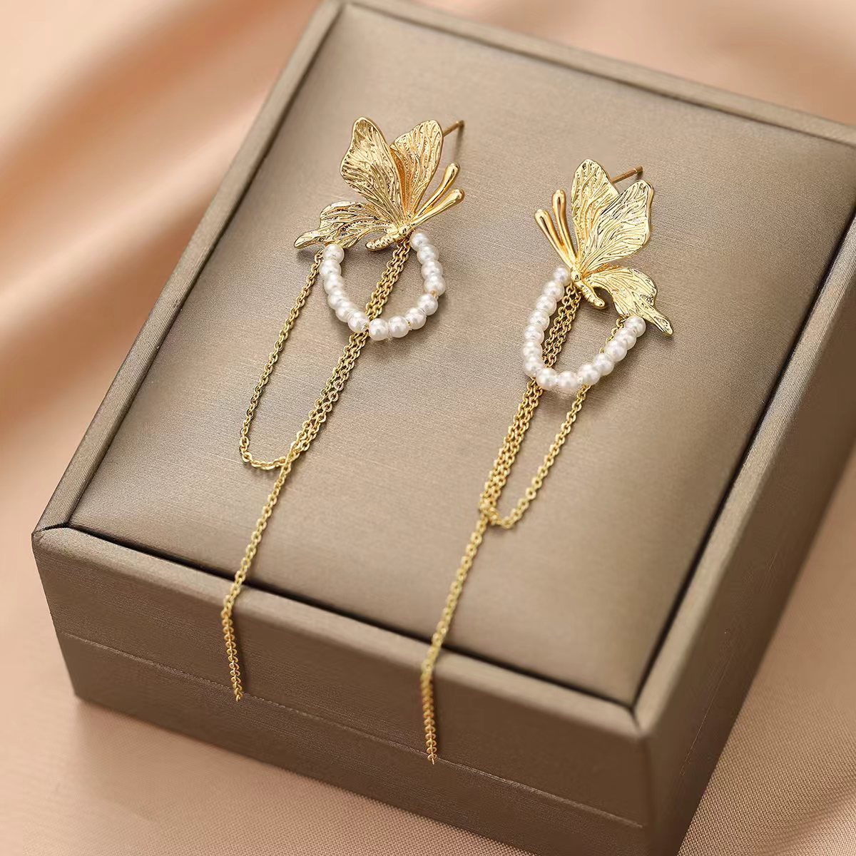 Silver Needle Butterfly Tassel Pearl Earrings Niche Accessible Luxury High-End Earrings Beautiful Romantic Stylish Fashion Earrings for Women