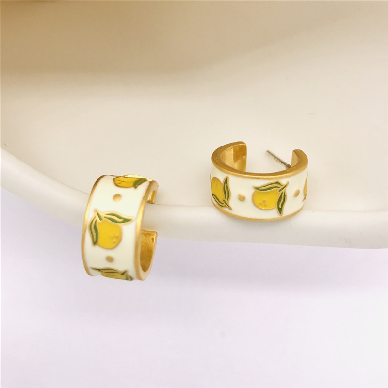 New European and American fashionable brass vintage matte gold court enamel fruit lemon shape French S925 earrings