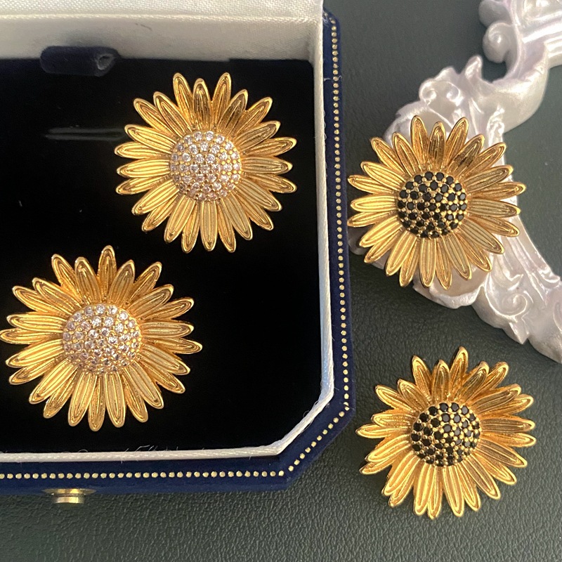 Autumn and Winter new brass gold-plated sunflower silver needle stud earrings light luxury high-grade sunflower black and white zircon earrings